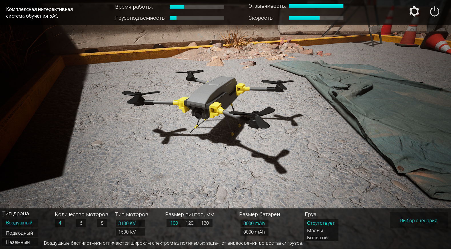 Симулятор предлагает широкий выбор настроек БПЛА, влияющих на полетные характеристики в соответствии с тем, как данные изменения влияют на полет реальных беспилотников.