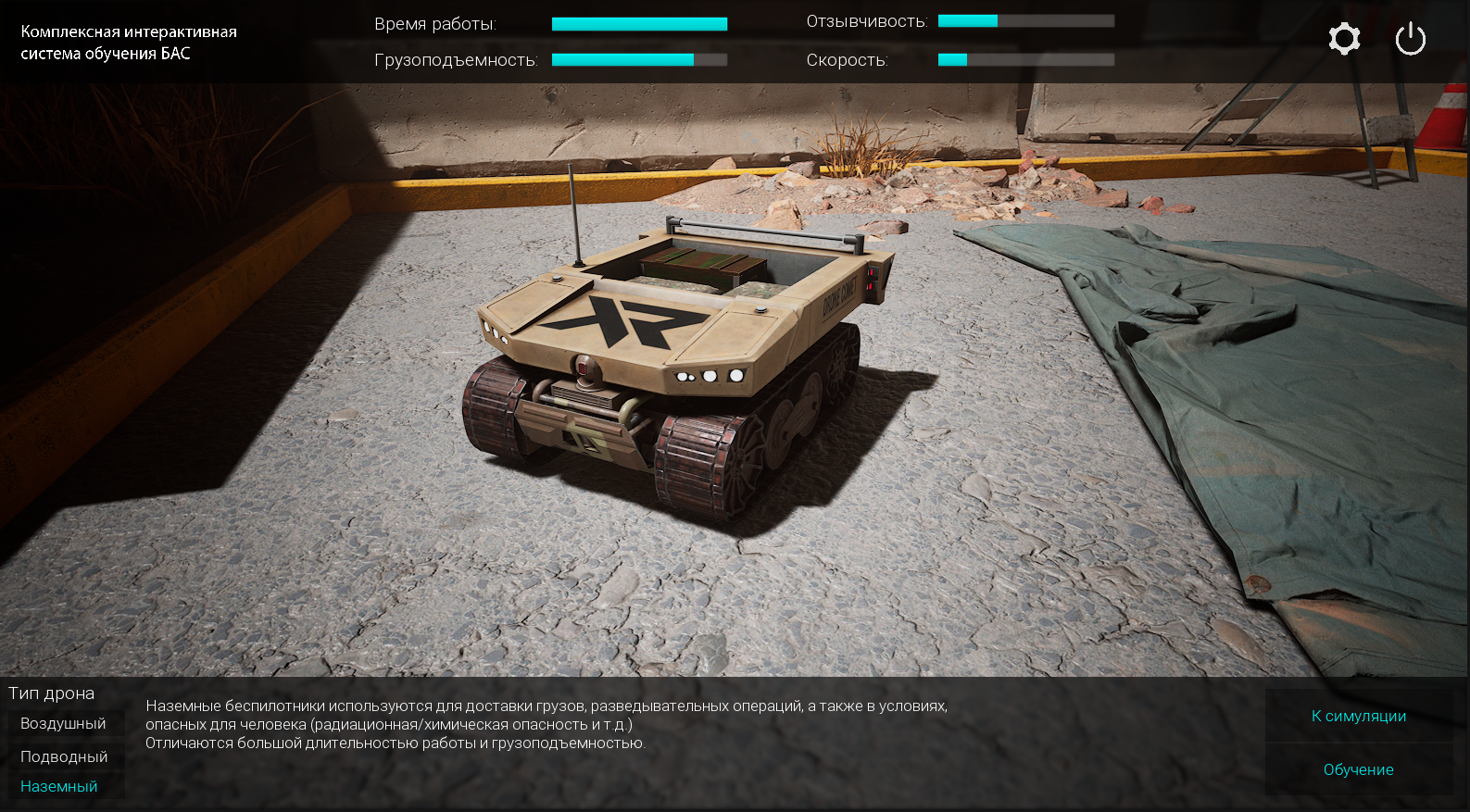 Симулятор предназначен для обучения операторов БПЛА базовым навыкам взаимодействия с наземными, подводными и воздушными беспилотными аппаратами.